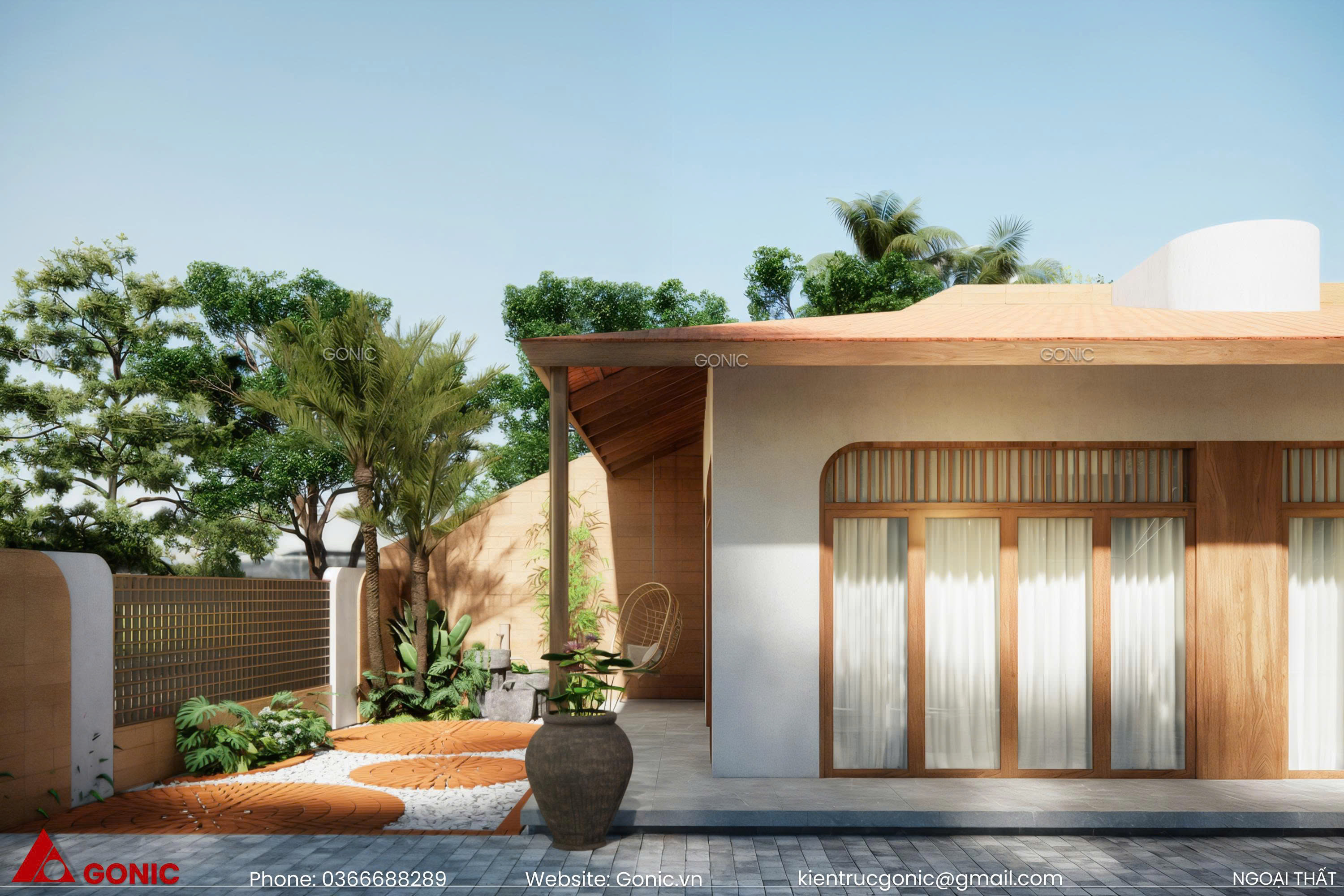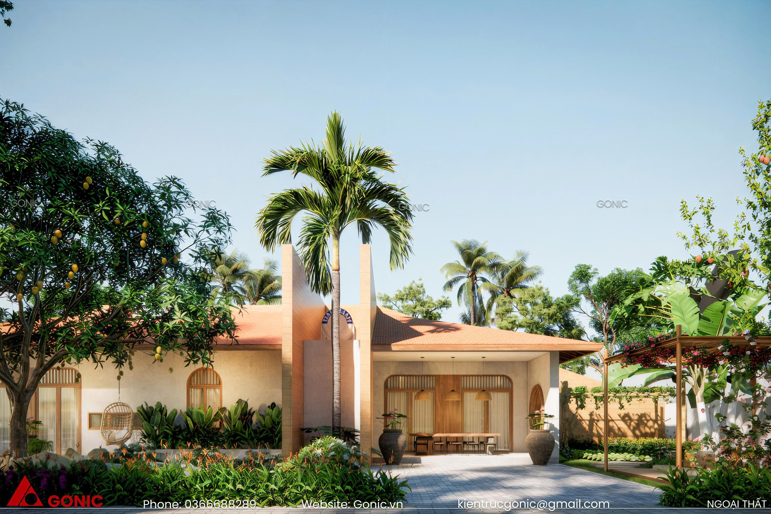 Mẫu nhà vườn mái ngói được Gonic thiết kế cho đôi vợ chồng trẻ với mong muốn có một không gian hòa mình giữa thiên nhiên, với diện tích sàn 200m2 bao gồm 4 phòng ngủ, 1 phòng làm việc và các công năng khác đều được sử dụng trong 1 tầng. KTS Gonic đã thiết kế công trình vừa có không gian riêng tư cho từng thành viên vừa có tiểu cảnh và các không gian sinh hoạt ngoài trời một cách hợp lí và chi tiết.