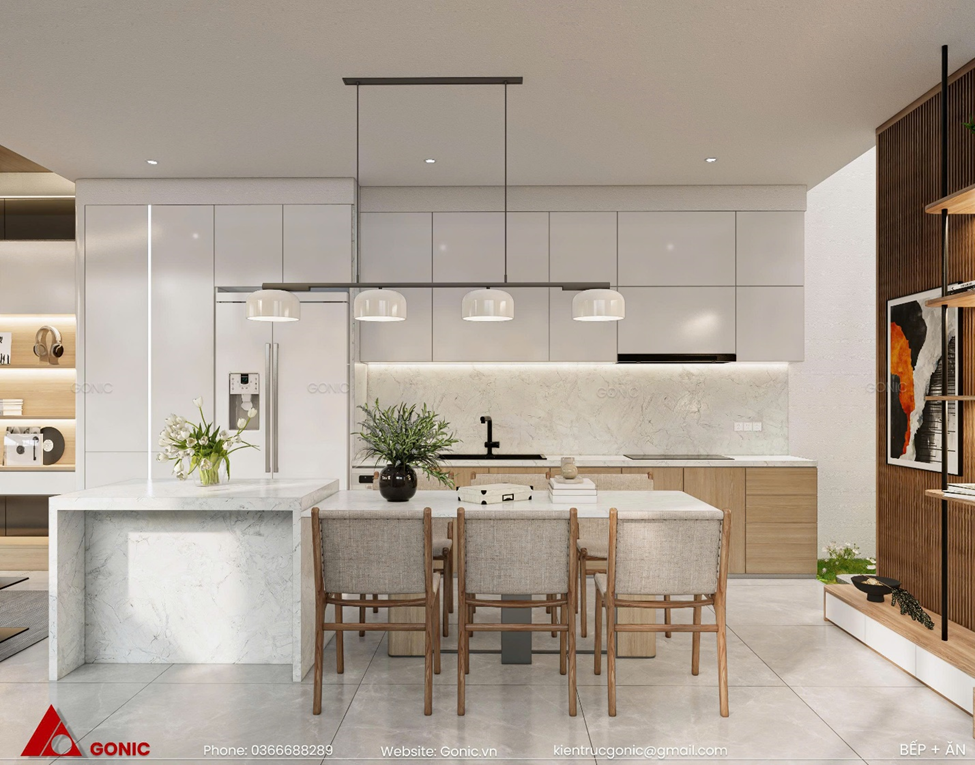 Tone màu sáng kết hợp cùng vân gỗ tự nhiên mang lại cảm giác nhẹ nhàng và thư thái, đồng thời làm nổi bật vẻ đẹp sang trọng của căn bếp. Bàn ăn đá trắng được đặt ngay trung tâm, vừa tinh tế vừa tiện dụng, đi kèm với hệ thống ghế gỗ bọc nệm, được bổ trợ bởi hệ đèn thả hiện đại, khiến gian bếp luôn tỏa sáng và ấm áp.